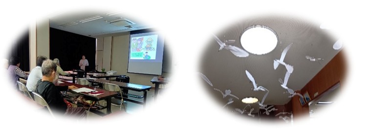 瀬戸内国際芸術祭2025を開催中の粟島で「目指せ100歳!心とからだの健康づくり」のテーマで講座を実施しました。会場入り口の天井では、竹製の白いカモメが風に舞うように出迎えてくれました。